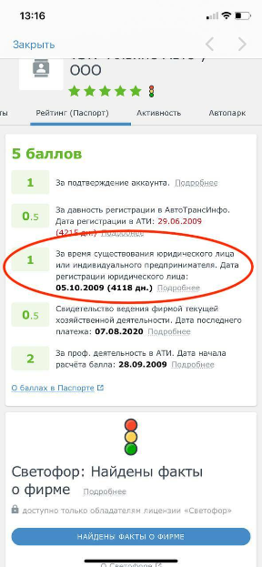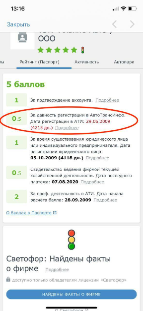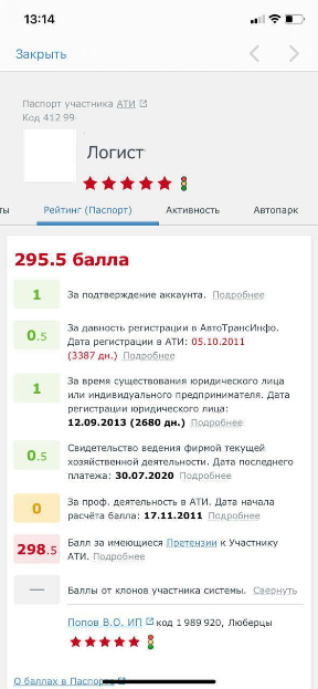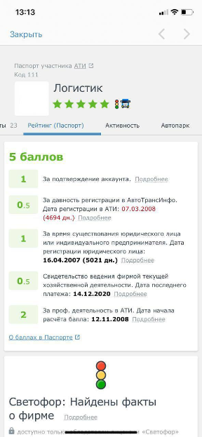 Балл начисляется автоматически в зависимости от срока регистрации в ATI.SU и только при наличии зеленого балла «Аккаунт подтвержден».