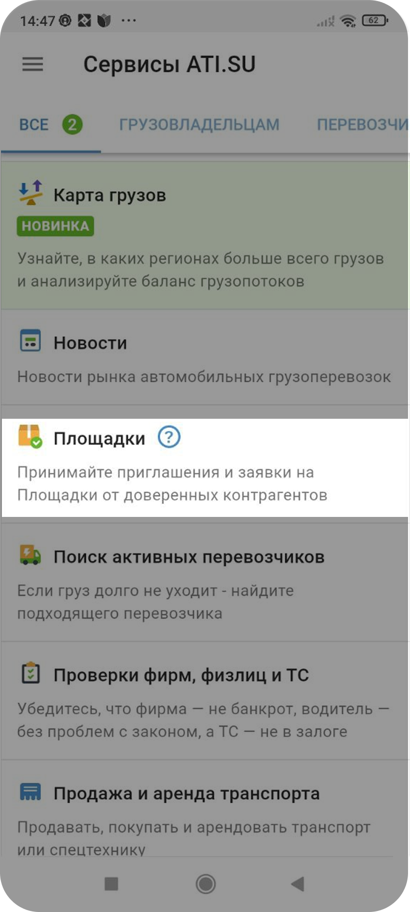 Чтобы перейти к площадкам, зайдите в меню приложения, выберите вкладку «Сервисы ATI.SU» и найдите в списке площадки.