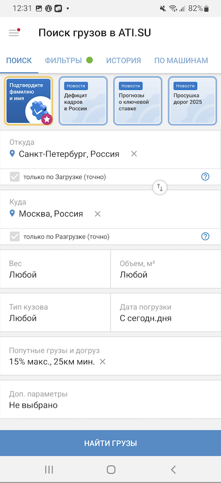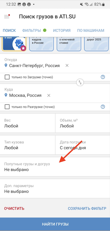 Если у вас уже есть груз, а в вашей машине еще осталось место, то воспользуйтесь инструментом «Попутные грузы и догруз» для поиска дополнительных попутных грузов на вашем маршруте.