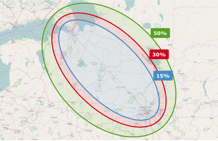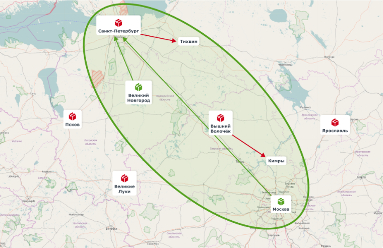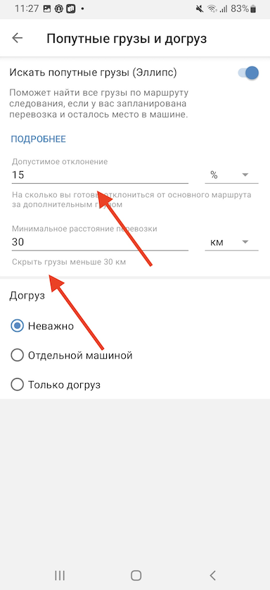 Если визуально изобразить область такого поиска, она окажется близка по форме к овалу. Отклонение от основного маршрута и минимальную длину попутной перевозки вы можете настроить под себя.