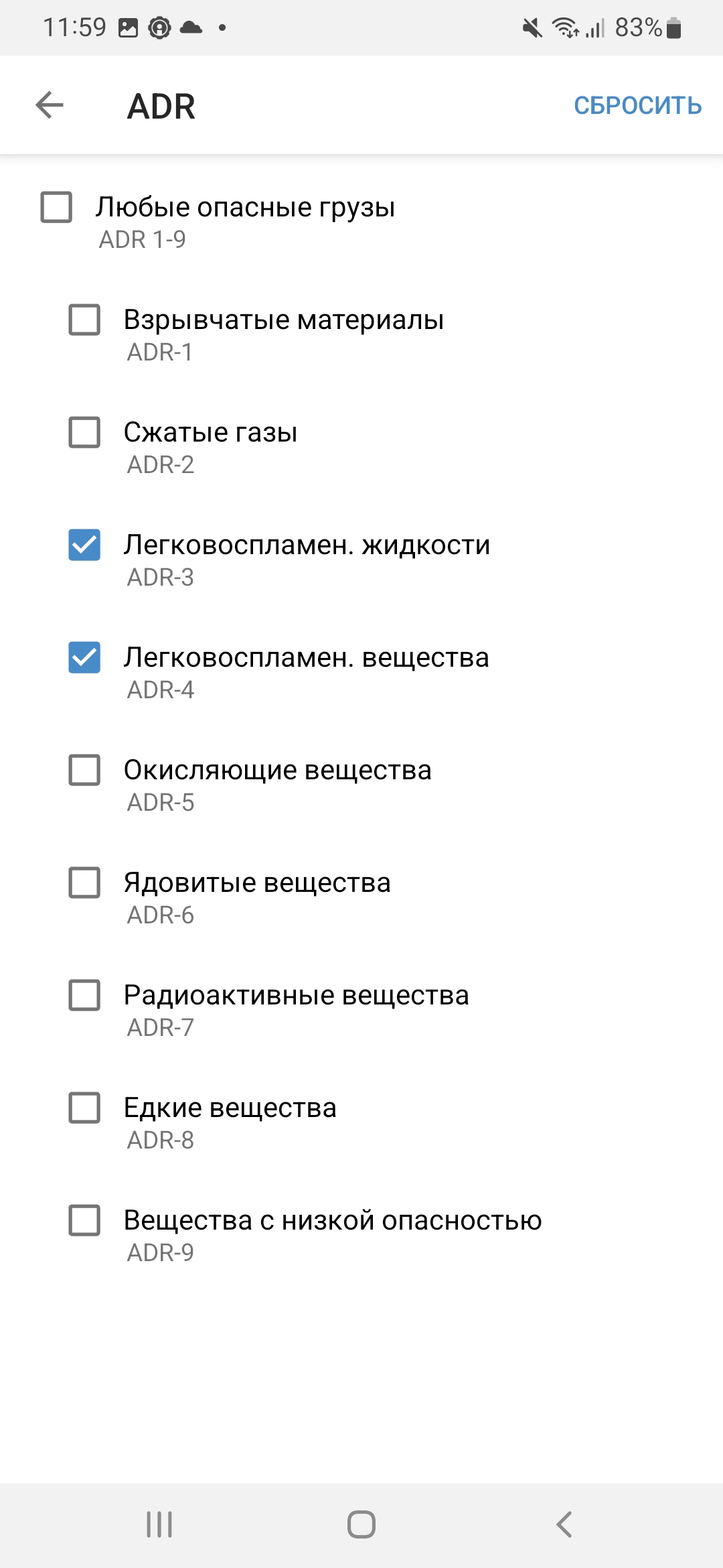 Выберите необходимый класс опасного груза и поставьте галочку напротив выбранного пункта или выберите несколько пунктов.