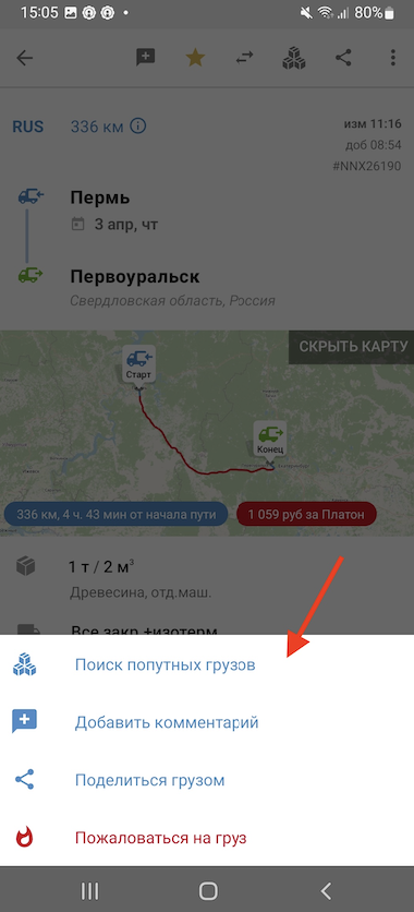 с карточки груза в Поиске,