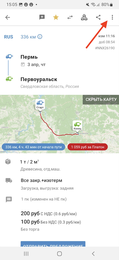 Для этого, например, в карточке груза нажмите на 3 точки.