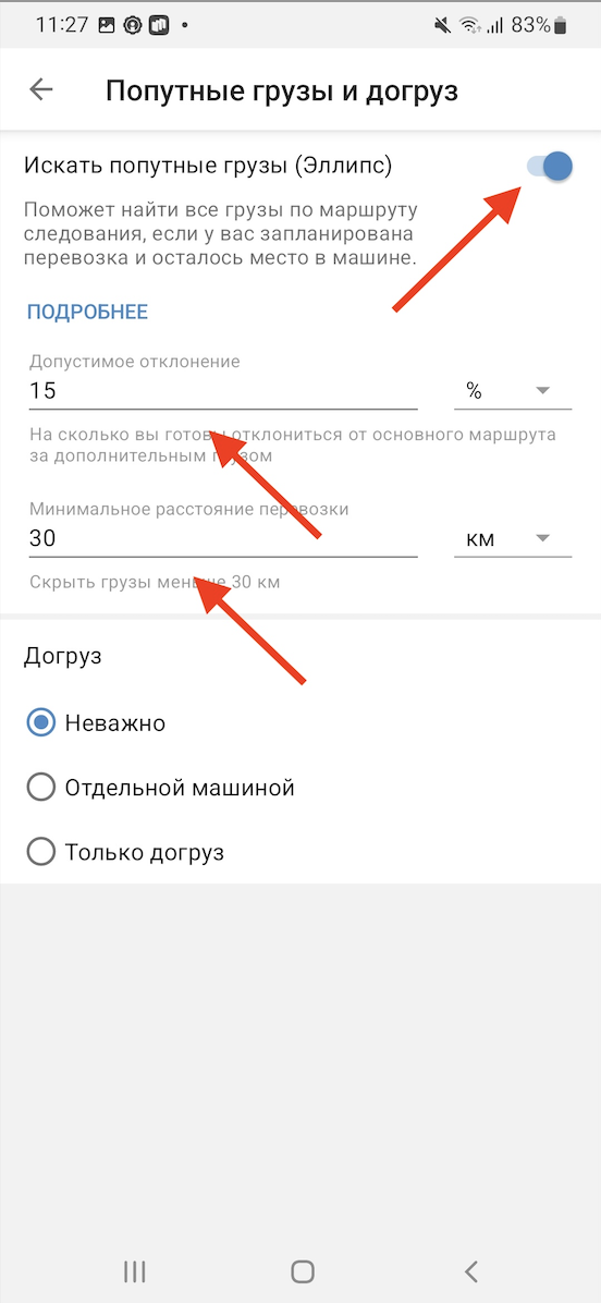 Если визуально изобразить область такого поиска, она окажется близка по форме к овалу. Отклонение от основного маршрута и минимальную длину попутной перевозки вы можете настроить под себя.