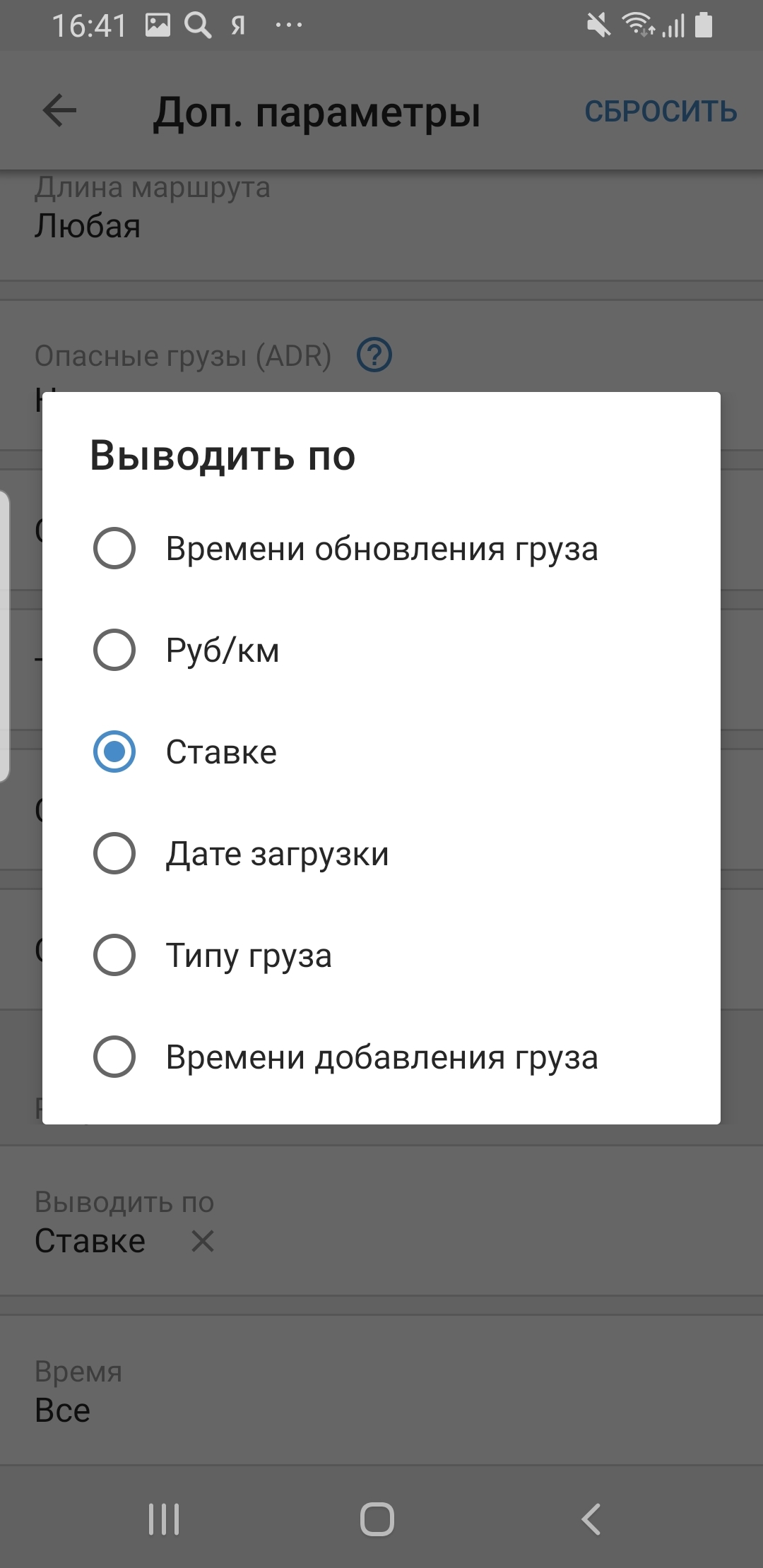 Выберите фильтр по «Ставке». При поиске в начале выдачи вы увидите грузы с самой большой ставкой.