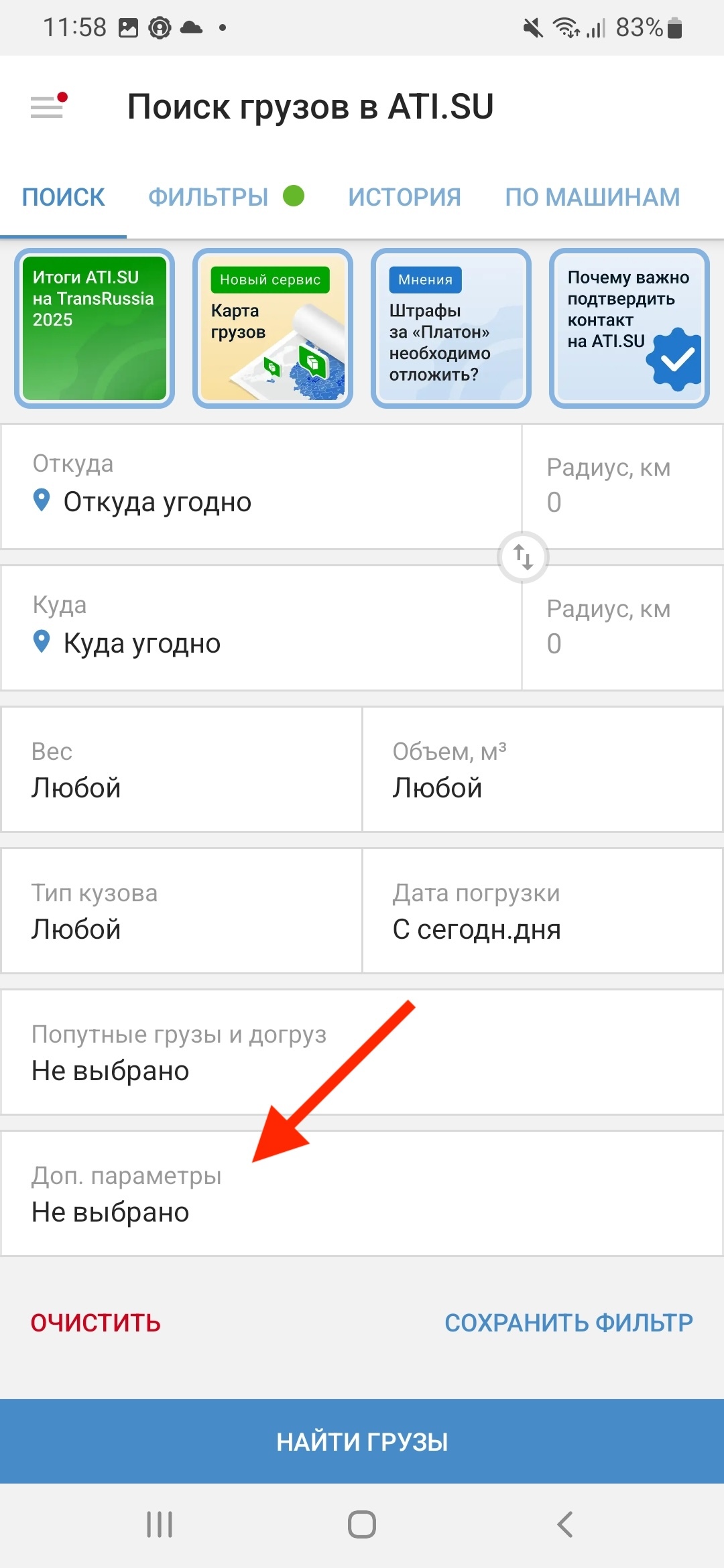 Также можно применить сортировку по ставке из Поиска — перейдите на страницу «Поиск грузов» и нажмите на раздел «Доп. параметры».