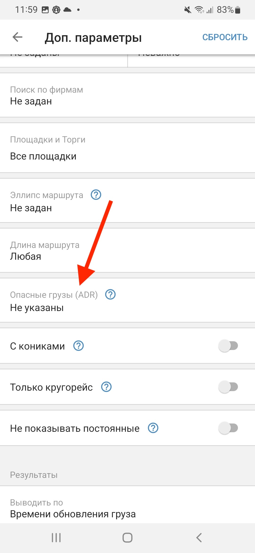 Чтобы применить фильтр «Опасные грузы (ADR)» — перейдите на страницу «Поиск грузов» и нажмите на раздел «Доп. параметры».