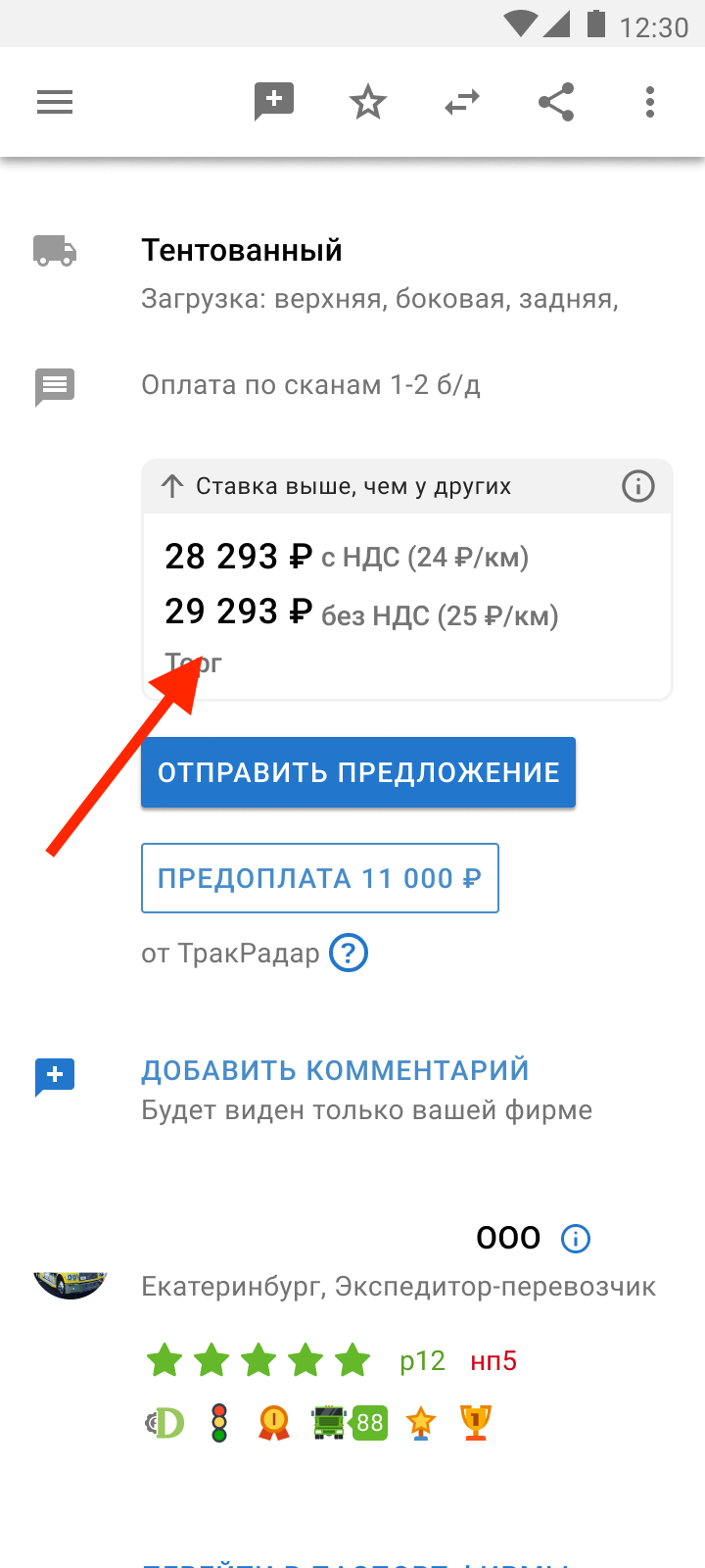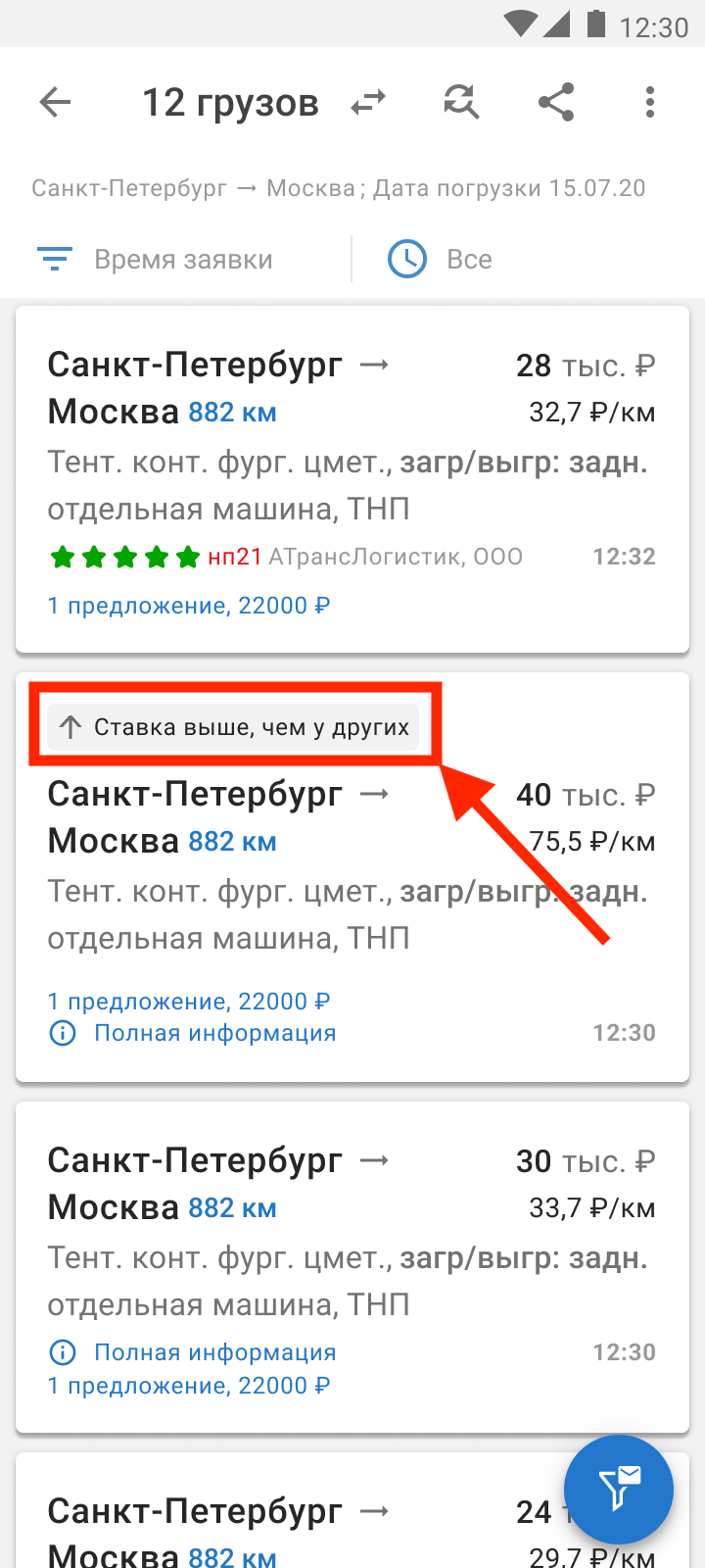 Информация о разнице в ставках видна при поиске груза. Чтобы узнать подробнее — перейдите в карточку груза.