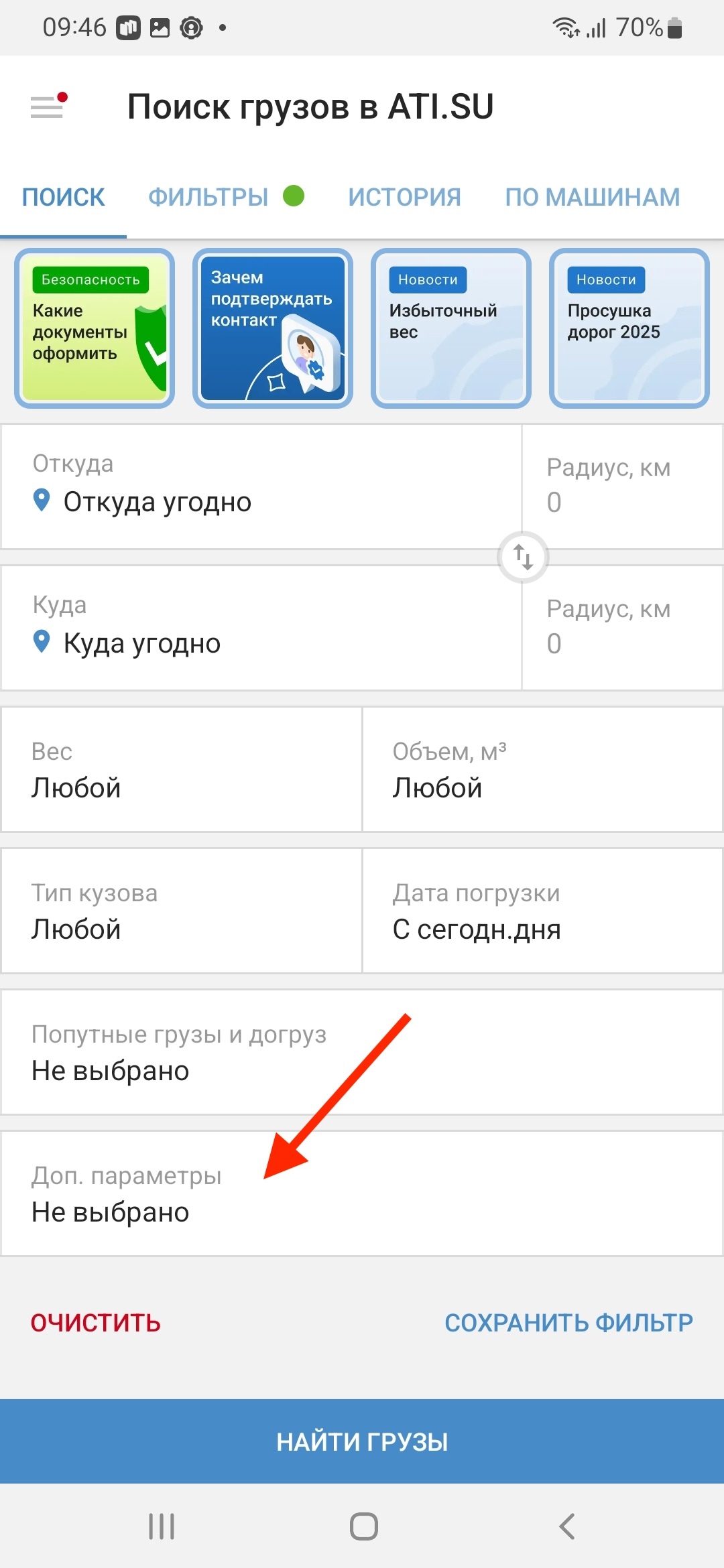 Перейдите в раздел «Доп. параметры» и в пункте «Догруз» выберите «Только догруз». Этот параметр поможет найти небольшие грузы, которые займут только часть места в вашей машине.