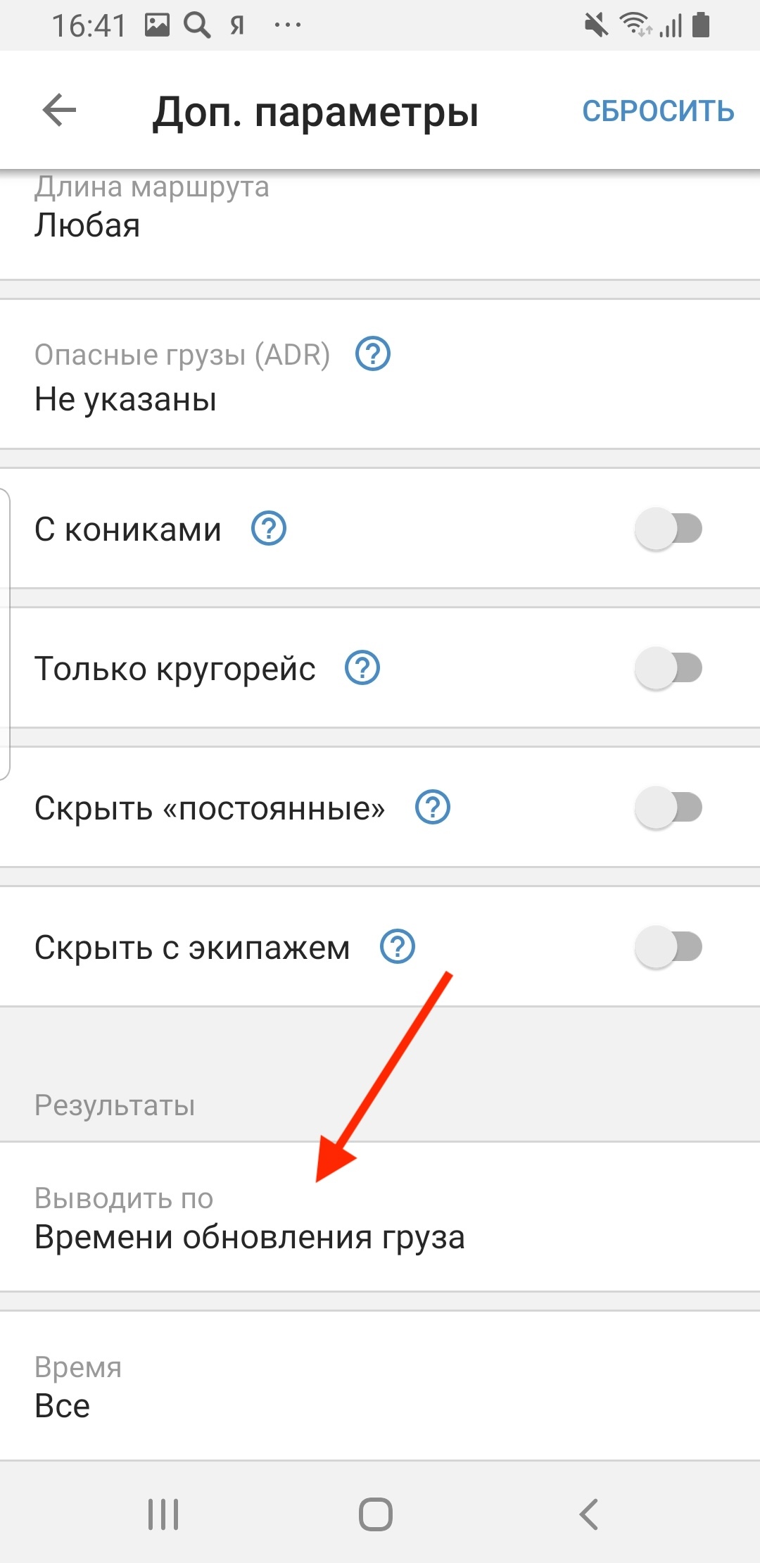 Переключите тумблер вправо — так, в поисковой выдаче не будет грузов с требованием экипажа.