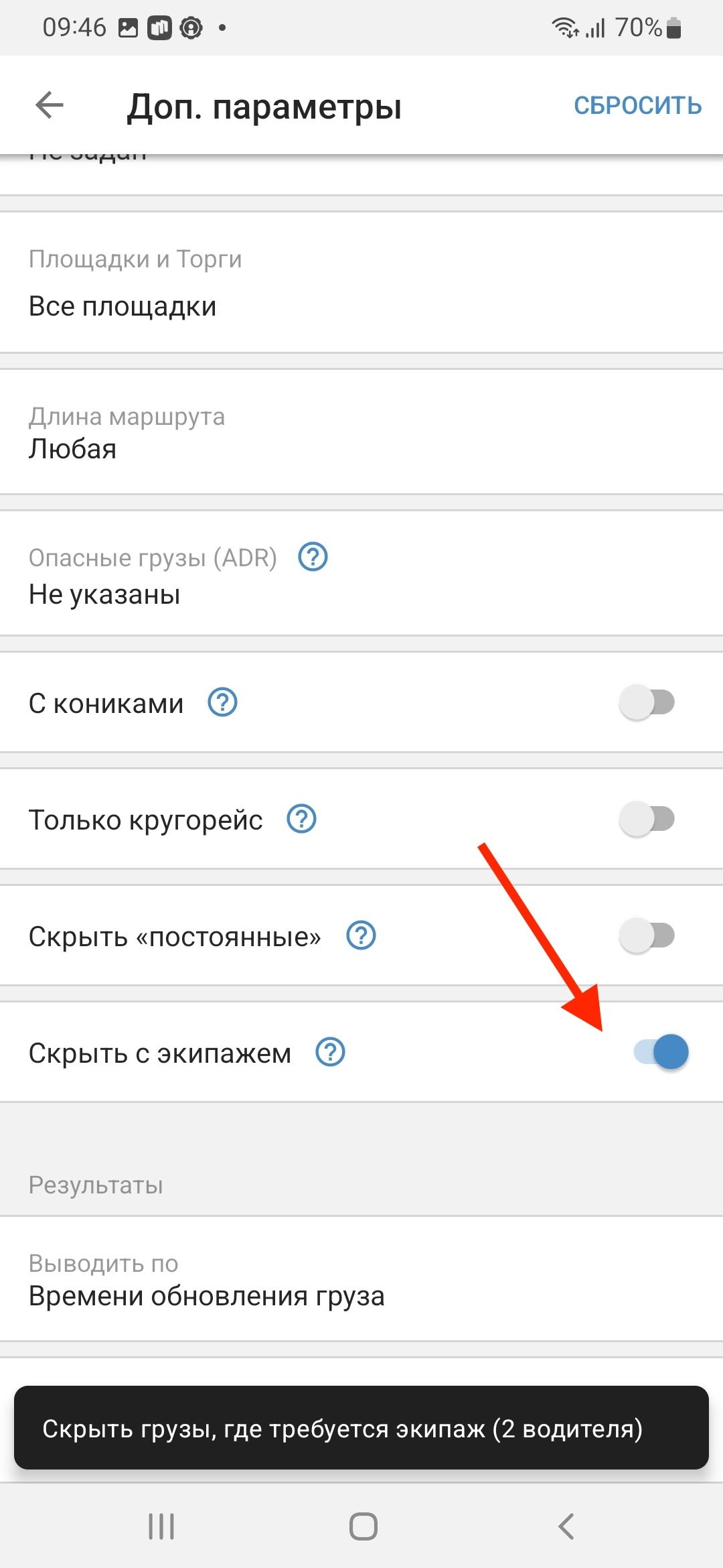 Если вам нужно исключить грузы из поисковой выдачи, где нужны два водителя — примените фильтр «Скрыть с экипажем». Это поможет быстрее находить только нужные грузы.